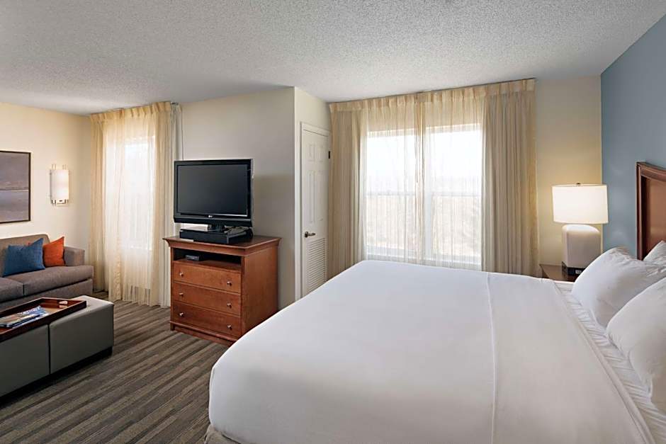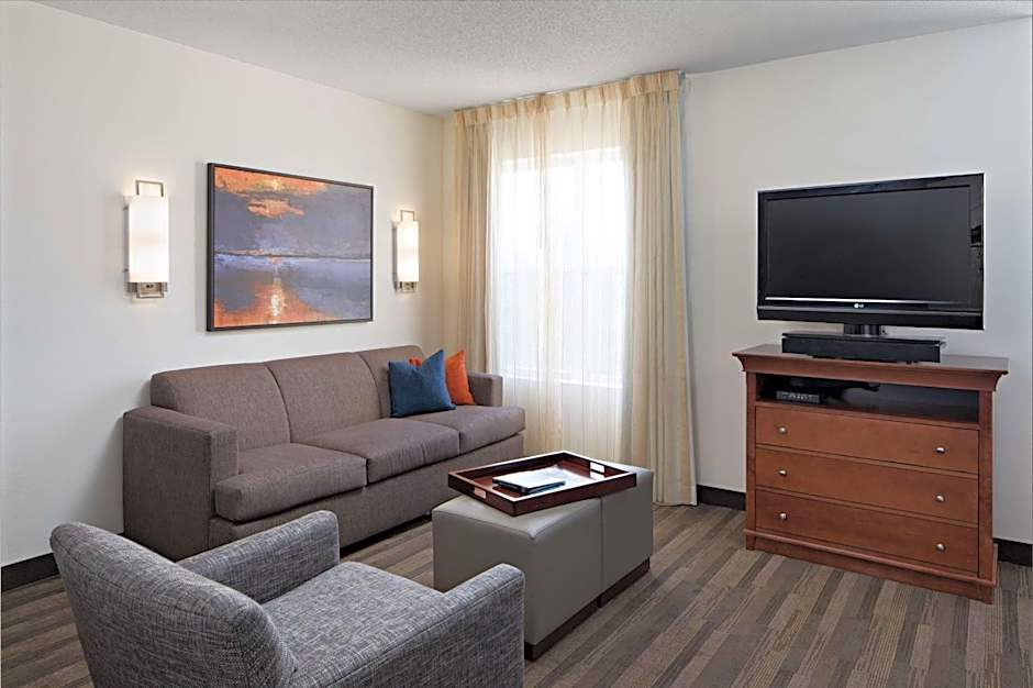 This suite has a full kitchen, a work space, and a living room with a sofa bed. The bedroom has a closet and a flat-screen TV.